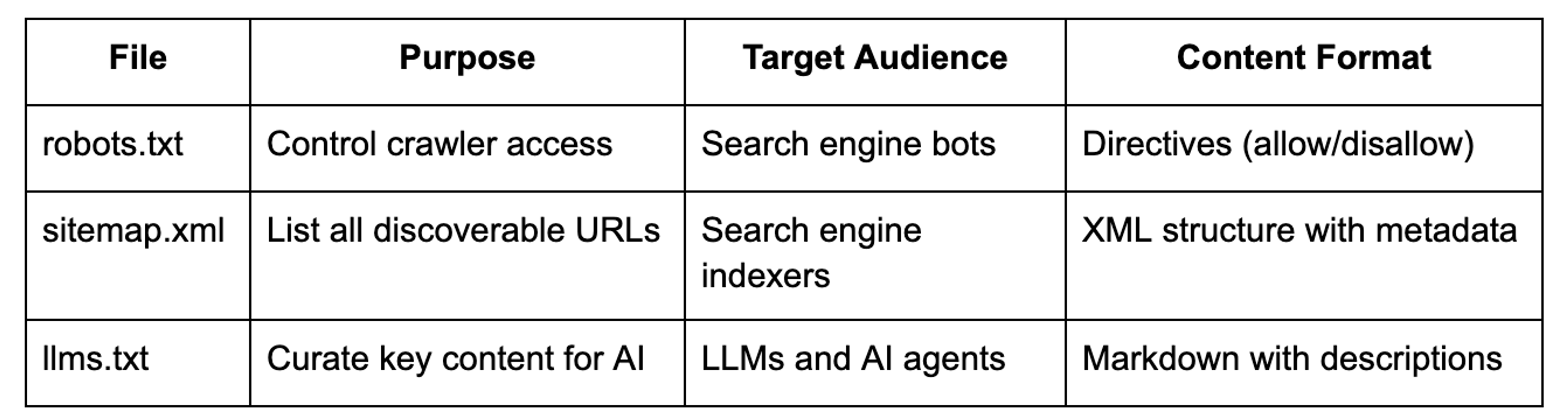 While robots.txt tells crawlers what they _can't_ access and sitemap.xml tells them what _exists_, llms.txt tells AI systems what _matters_. It's a tool of inclusion rather than restriction—you're not blocking access, you're providing context that helps AI agents understand your content hierarchy.