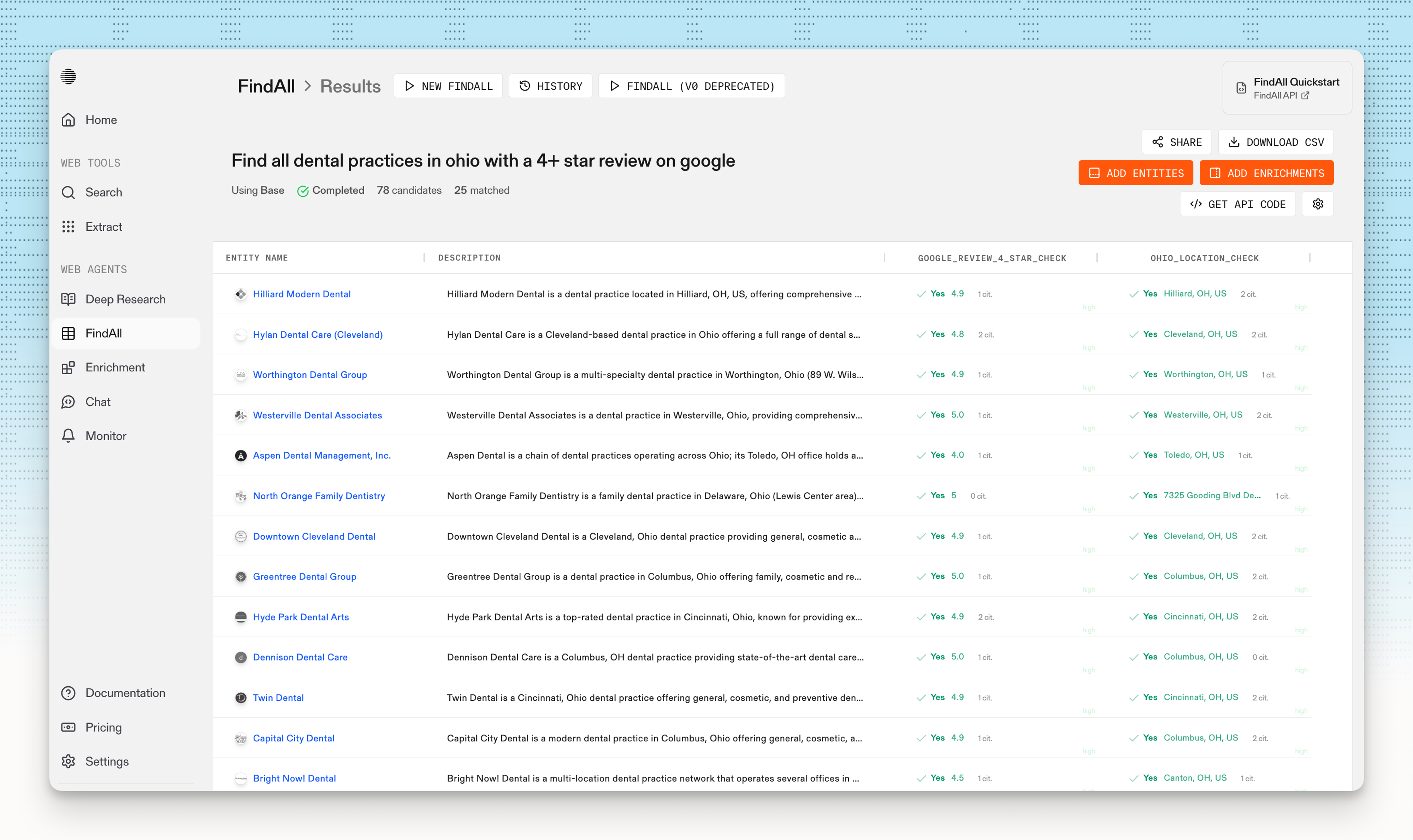 **FindAll** finds any set of entities (companies, people, events, locations, houses, etc.) based on a set of match criteria. For example, with **FindAll, **you can run a natural language query like “Find all dental practices located in Ohio that have 4+ star Google reviews.”