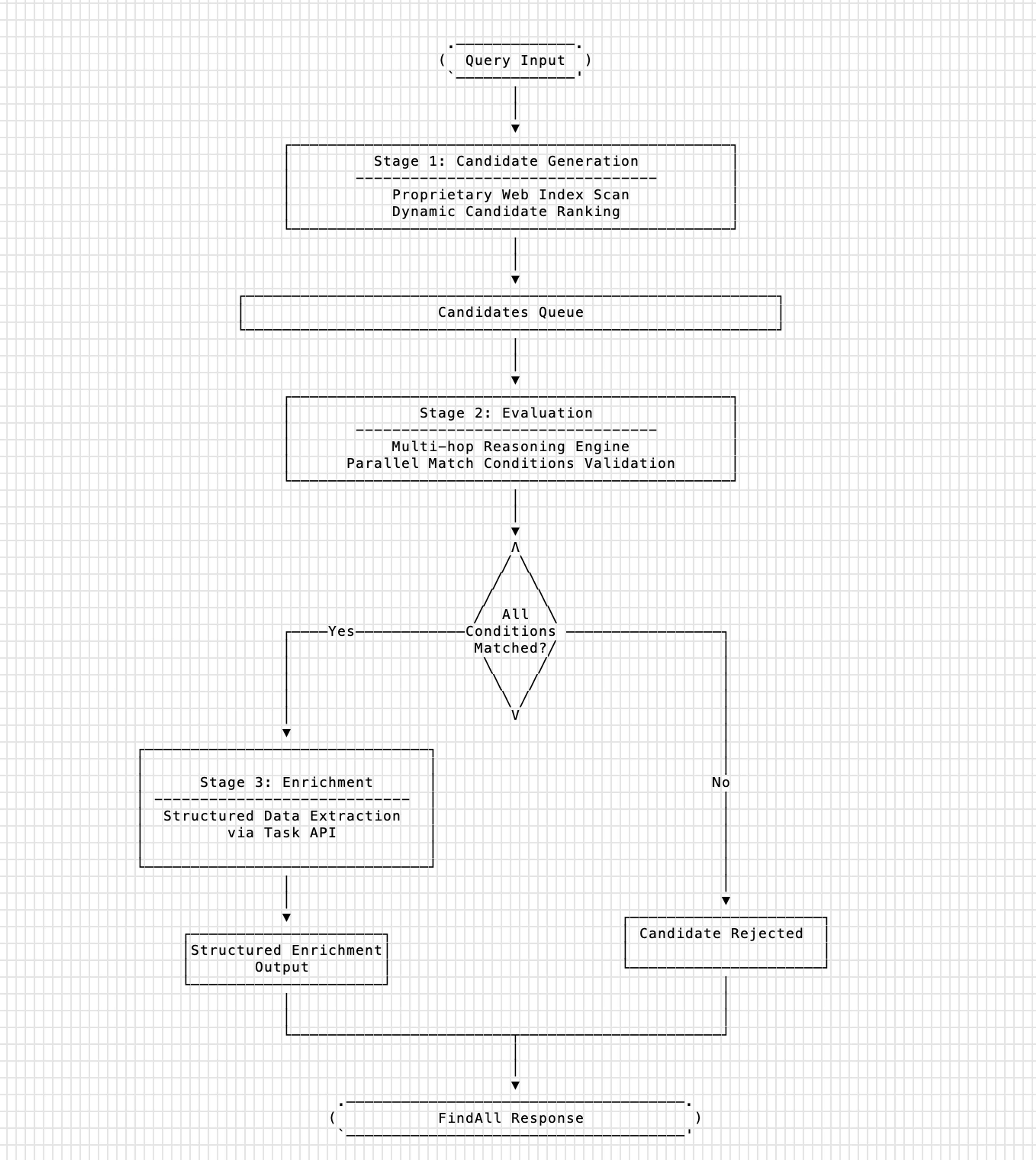 **1. Generate candidates from web data: FindAll** searches across our proprietary web index to identify potential entities matching your query. Unlike traditional search, which returns a fixed result set, **FindAll** generates candidates dynamically based on your specific criteria.